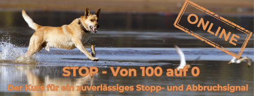 Mit dem Onlinekurs „STOP – Von 100 auf 0“ passiert das nicht mehr! Lerne, wie du aus einem auf Durchzug schaltenden Dickkopf einen Hund, der auf dein Stopp- und deinen Abbruchsignal hört – zuverlässig und jederzeit.