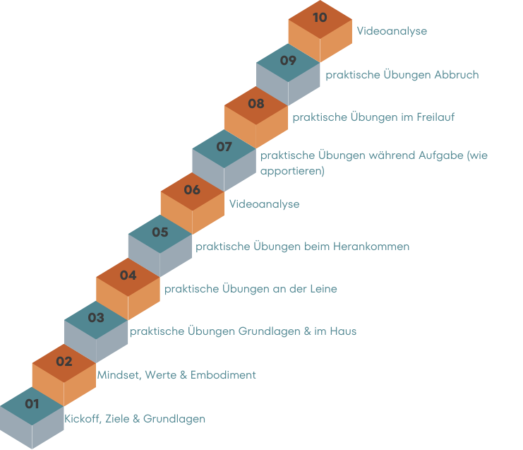 Von einfachen Übungen für den Alltag bis hin zu komplexen Trainingssituationen – Schritt für Schritt bauen wir die Kommunikation zwischen dir und deinem Hund auf. Dabei gehen wir von Nah zu Fern und vom Einfachen zum Komplexen.